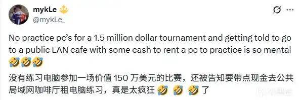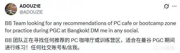 要知道职业选手赛前最看重 “手感保持”,每天至少 6 小时训练赛是标配。2022 年 PNC 国家杯冠军 mykle 直接发推吐槽,刚落地曼谷就忙着找网吧,语言不通加上设备陌生,备赛冲刺节奏全被打乱。更离谱的是 PGS8 冠军 BB 战队选手 ADUOZIE,作为刚拿下洲际赛冠军的强队核心,本该专注战术打磨,却要花时间对比当地电竞馆配置,生怕键鼠手感影响发挥。
